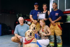 Front row - Phil Wallberg, Ambassador Guide Dogs Jasmine and Jake, Denise Robertson and Rooster Cogburn. Back row - Fire Captain Curtis Hooper, Pam Bennett-Wallberg, and Fireman Lou Santos