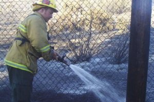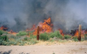 It was a balmy summer day in Morongo Valley. The meerkats were awaiting the "Bug Truck's" arrival and the "cricket sprinkle" which has become the ritual on every delivery day. As Denise, our volunteer development director, was clearing pine needles off the roof of the enclosures she noticed an ash- filled cloud rising across the highway. It was accompanied by an acrid smell of smoke. The thought of a fire sent her to the cottage to alert director Pam Bennett-Wallberg. Phil, our operations manager, and Ricardo, Phil's wonderful assistant, joined us on the edge of the acreage where we had an unobstructed view of the smoke plume. It was a fire alright - burning hot and fast. The wind was getting stronger by the minute and blowing the flames directly toward the Center.