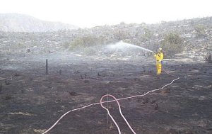 While the animal crates were unloaded into the cottage to keep the animals cool, Phil set up our emergency generator to provide power for lights and appliances. We all helped the fire personnel put out "hot spots" and places where the flames continually re-ignited. All our fence posts were smoking or still in flames and the view just outside our fence line was hard to grasp. As far as the eye could see, in all directions, the ground was black and burned of all vegetation.