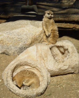 Currently, we are in the midst of a classic "Kalahari" winter, complete with clear, cold days and downright frigid nights! As many of you know, Morongo Valley was chosen as the location for Fellow Earthlings' Wildlife Center specifically because the climate closely resembles that of the meerkats' native Kalahari Desert in southern Africa. Even so, we humans take care to ensure our "wee ones" are comfy and cozy all winter long.