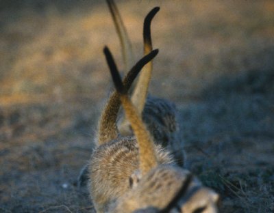 "Take Three!" Pam forgot to hide the "Bug Mug." The meerkats dashed out but, being meerkats, they found the "Bug Mug" far more interesting than the crew who were valiantly trying to get the meerkats within camera range by flapping their arms and making odd noises. The meerkats promptly stretched out in the sun and enjoyed the human show. We called this "Take Three - And, they call us animals?"